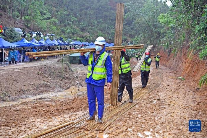 坠机事故现场下雨 工作人员铺设竹排小道