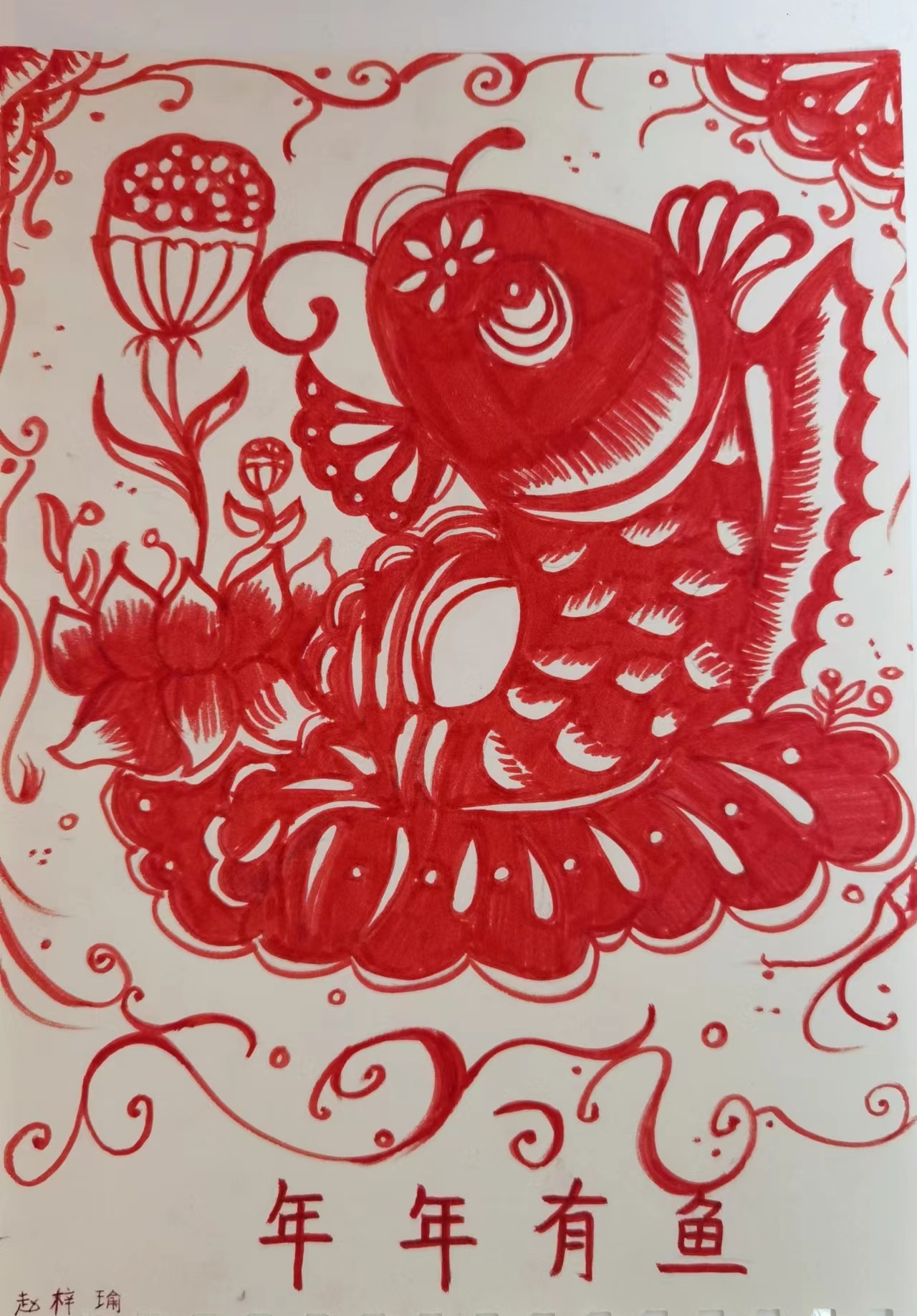 妈妈每年过年时都会在窗户上贴上不同的剪纸窗花。在今年春节时,我就画了一幅剪纸风格的年画,这样我们就可以一直把它挂在墙上,年年有余。