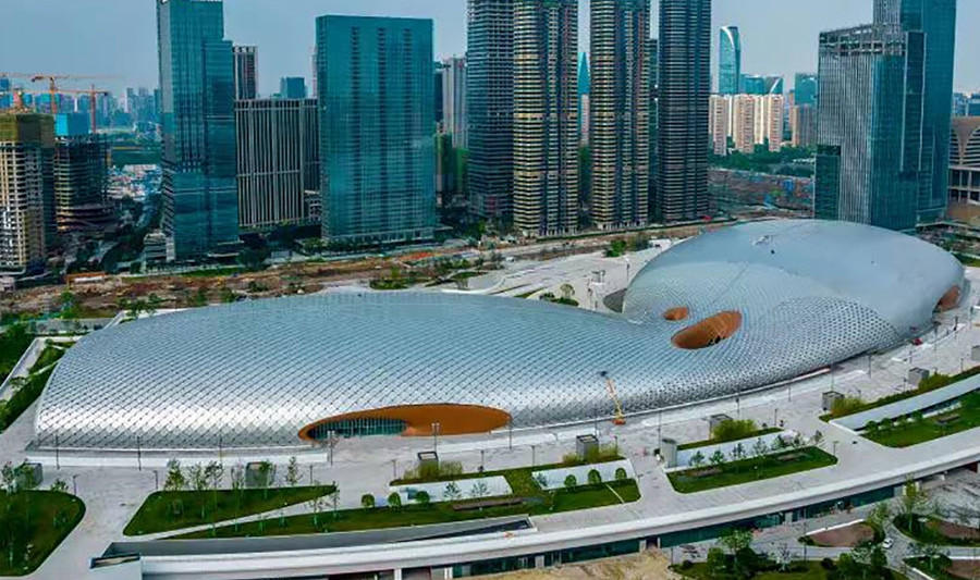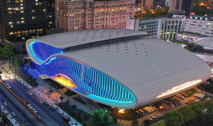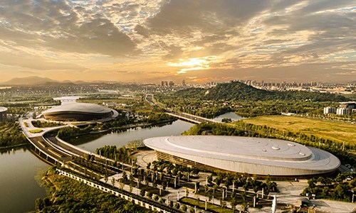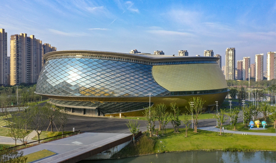 杭州奥体中心游泳馆为亚运会游泳、跳水、花样游泳项目比赛场馆及训练场馆,位于杭州市萧山区,总建筑面积53959平方米,观众席位数约6000个,是一个集游泳、跳水比赛和训练为一体的专业运动场馆。场馆拥有双馆合一的设计理念、独特的流线造型,结合双层全覆盖银白色金属屋面,和两翼张开的平台形式……作为世界上最大的两馆连接体非线性造型场馆,无论白天夜晚,颜值都超高。