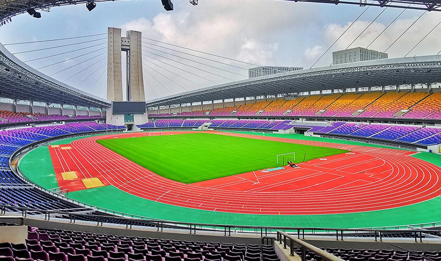 黄龙体育中心体育场为亚运会足球项目决赛场馆,位于杭州市西湖区,风景秀丽的西子湖畔,处在整个黄龙体育中心的西南侧,在亚运村的西北方向且相距约11.5公里。总建筑面积103338平方米,观众席位数51971个。
