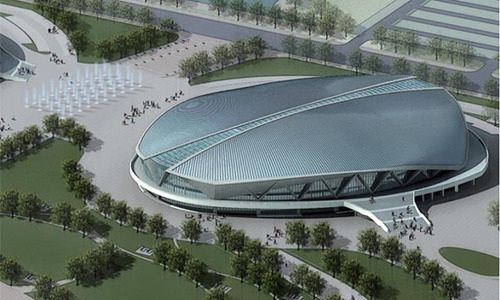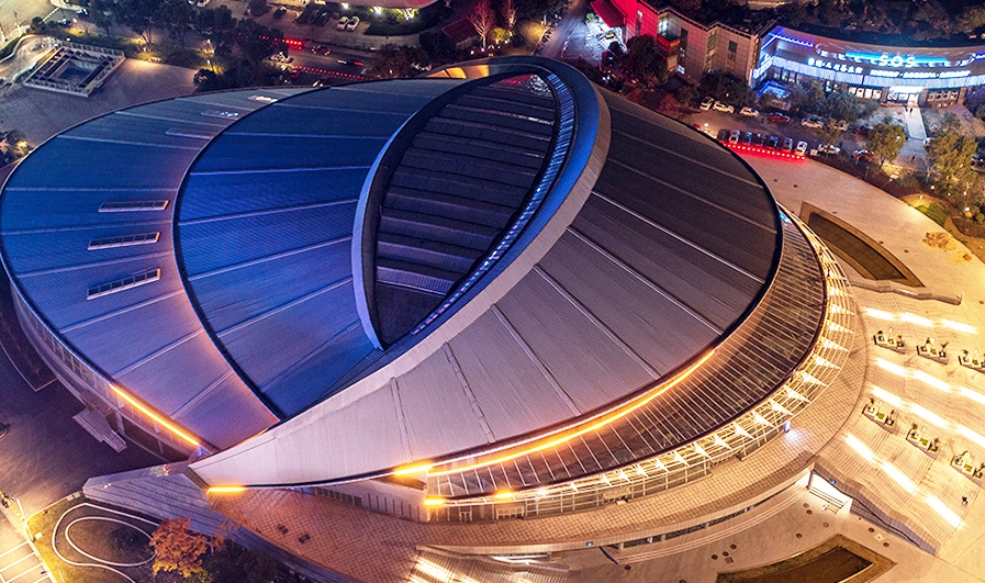 绍兴奥体中心体育馆为亚运会篮球项目比赛场馆,位于绍兴市越城区,在亚运村东南方向且相距约38.8公里。总建筑面积72010平方米,观众席位数9552座。场馆圆形的外壳,规则的银灰色流线型线条,像是江南水乡常见的河蚌。