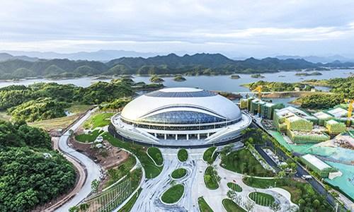 淳安界首体育中心自行车馆为亚运会场地自行车项目比赛场馆,位于杭州市淳安县界首乡,地处亚运比赛项目中心位置,场馆包含比赛及热身场馆。项目基地山环水绕,库湾众多,山体平缓,村庄零星散落,环境优美,生态优良。总建筑面积24282平方米,观众席位数3000个。