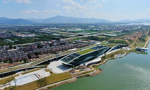 温州龙舟运动中心为亚运会龙舟项目比赛场地及训练场馆,位于温州市瓯海区,含综合馆、终点塔及观龙台。龙舟竞渡在温州已有二千年历史,温州市被称为“中国龙舟名城”,该基地赛后将永久性保留,作为全国最专业的龙舟竞赛基地。总建筑面积23713平方米,观众席位数344座,沿河两岸约有20000个站席。