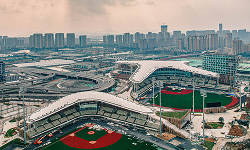 绍兴棒(垒)球体育文化中心为亚运会棒垒球项目比赛场地,位于绍兴柯桥区和镜湖新区交界处、杭绍台高速公路镜湖互通附近。其中,棒球项目用地面积 120666平方米,总建筑面积 145000 平方米,其中地上建筑面积89200平方米,地下建筑面积55800平方米。功能区包括一个棒球主?。ㄗ皇?000个),一个棒球副?。ㄗ皇?500个),一个集训中心和一个体能训练馆。垒球项目用地面积 42666平方米,建筑面积8000平方米,含一个垒球主?。ㄗ皇?000个),一个垒球副?。ㄗ皇?00个)。